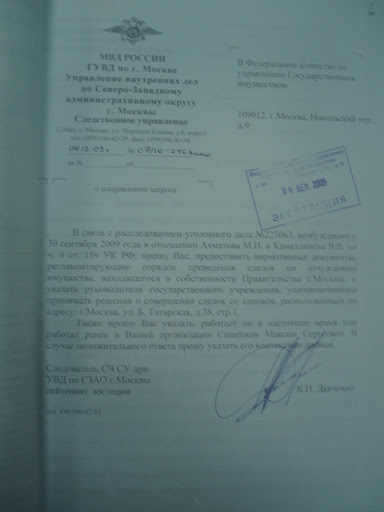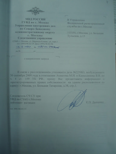 И в заключении хочу сказать, что 09.12.10 года мы получили официальный ответ из ЕГРП на недвижимое имущество и сделок с ним о том, что здание по адресу: г. Москва, ул. Большая Татарская дом 38/1 стр. 1 продано и сегодня принадлежит не государству, а двум физическим лицам. Оригинал ответа из ЕГРП на недвижимое имущество и сделок с ним на здание по адресу: г. Москва, ул. Большая Татарская дом 38/1 стр. 1 от 09.12.10 г. прилагаю.