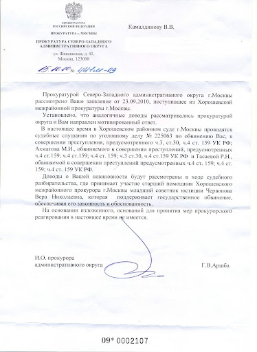 Обвинение в отношении Камалдинова В.В. поддерживает старший помощник Хорошевского межрайонного прокурора гор.Москвы младший советник юстиции (майор) Червонова Вера Николаевна. И по заверению первого заместителя прокурора СЗАО гор.Москвы Г.В.Аршбы (см. приложение) именно Червонова В.Н. обязана обеспечить законность и обоснованность обвинения Камалдинова В.В. в суде.